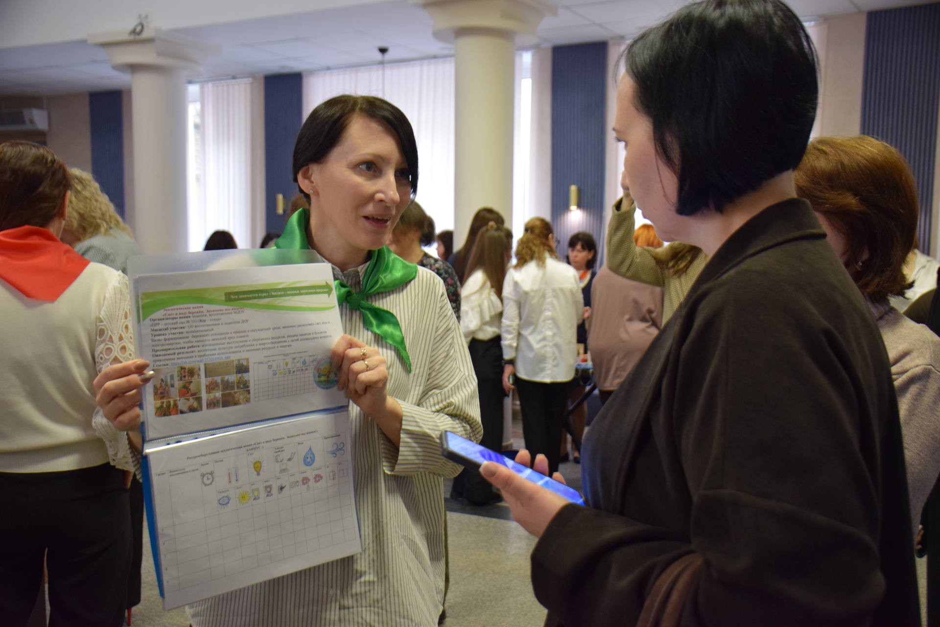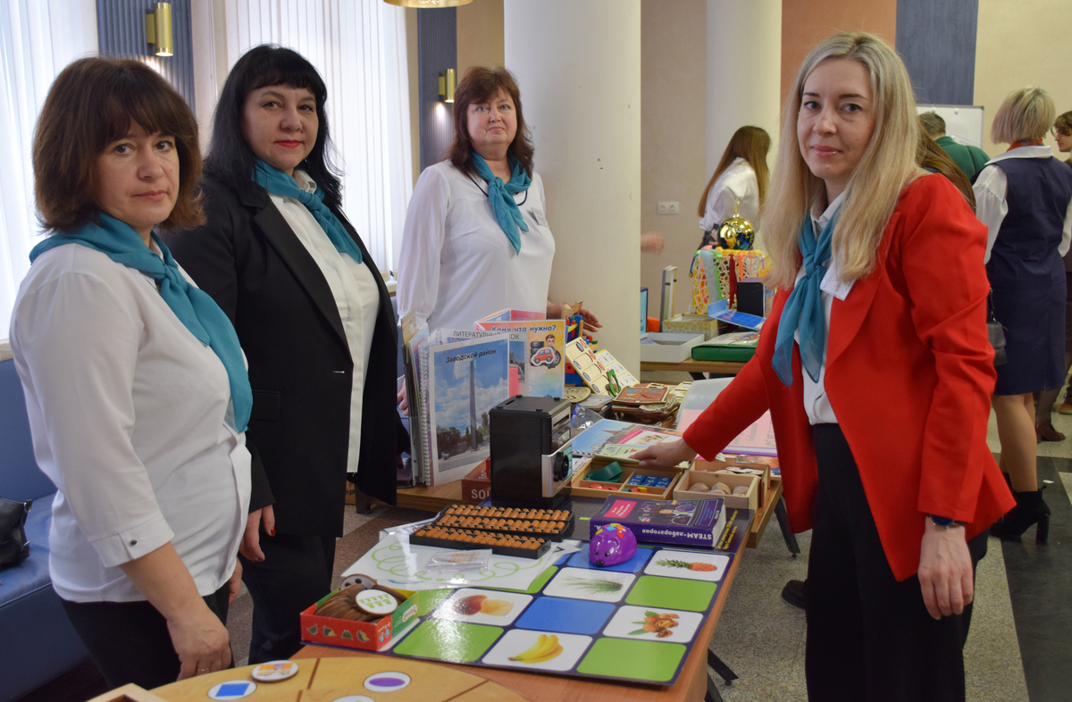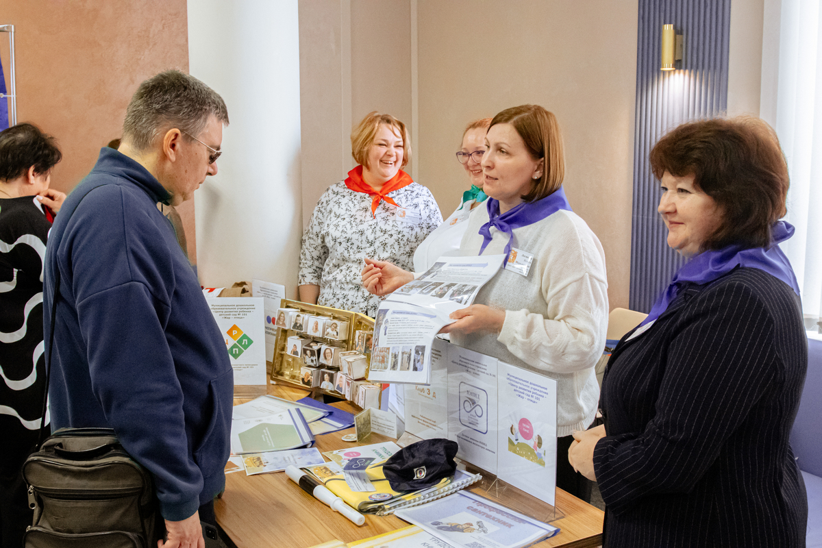 Перед началом работы интенсива в зоне регистрации работали интерактивные площадки – были развёрнуты стенды, где сотрудники дошкольных образовательных организаций представляли лучшие практики работы с детьми. Участники делали памятные снимки в фотозоне.