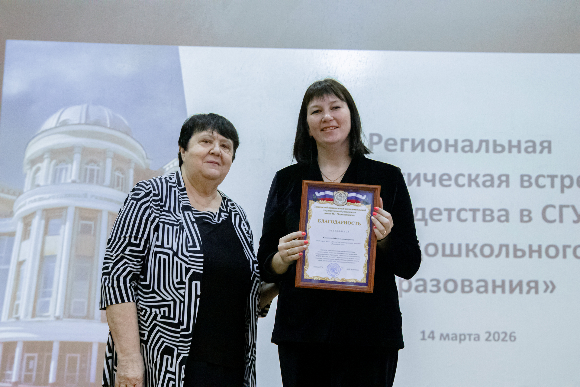 Елена Генриховна вручила благодарственные письма ректора СГУ А.Н. Чумаченко сотрудникам дошкольных образовательных организаций за участие в реализации практической подготовки педагогических кадров для системы дошкольного образования и многолетнее сотрудничество с Саратовским университетом.