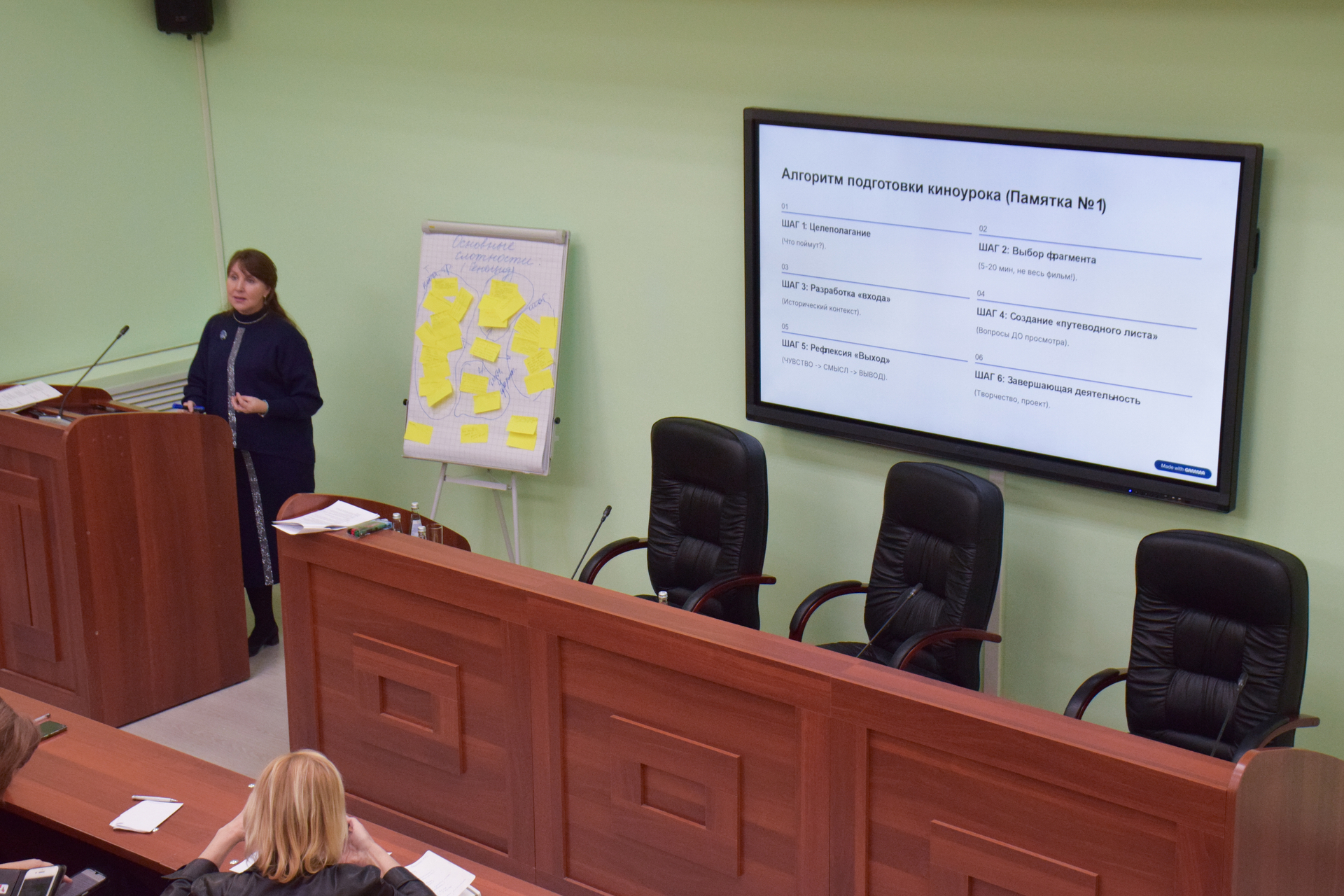 Далее педагоги приняли участие в создании плана киноурока. После просмотра одной из серий цикла короткометражных художественных фильмов проекта «Дети войны» участники разбились на группы – историков, аналитиков, психологов и творцов. В конце мастер-класса было уделено внимание психологической безопасности при проведении киноуроков.