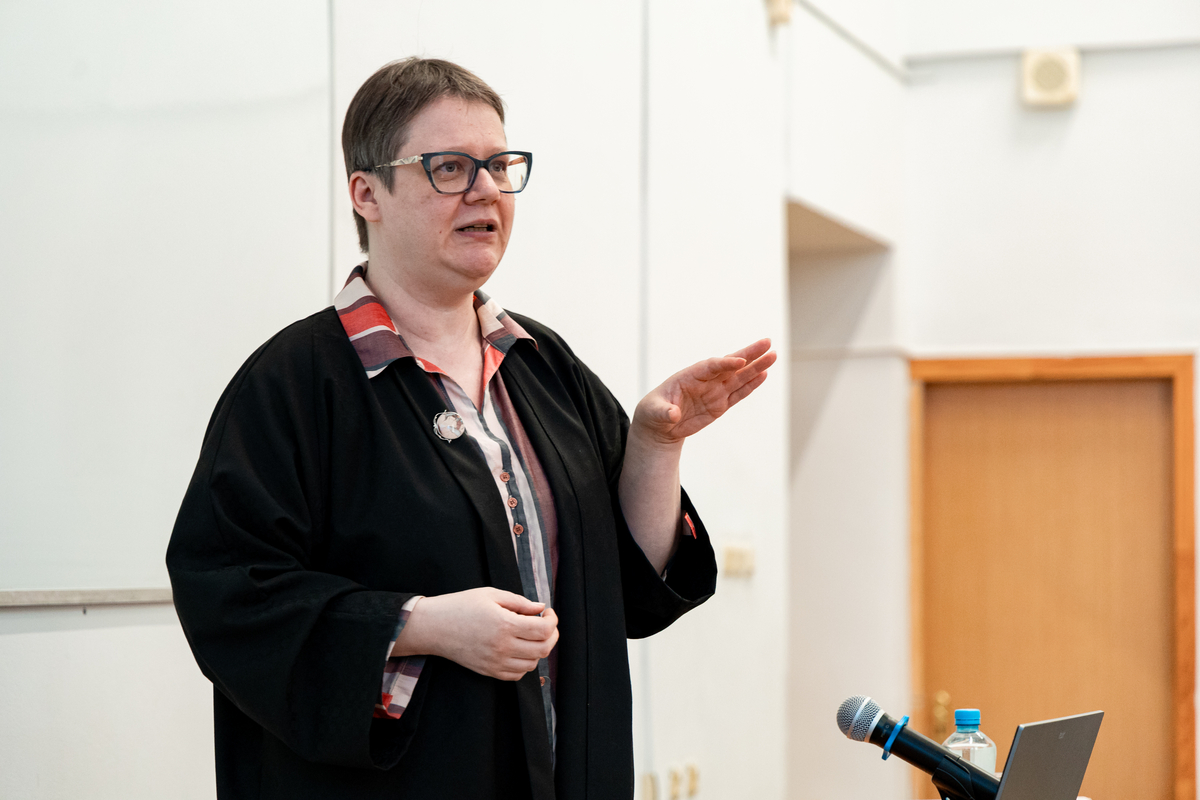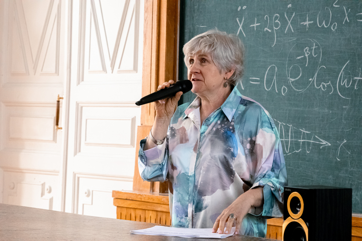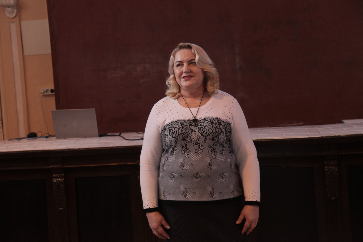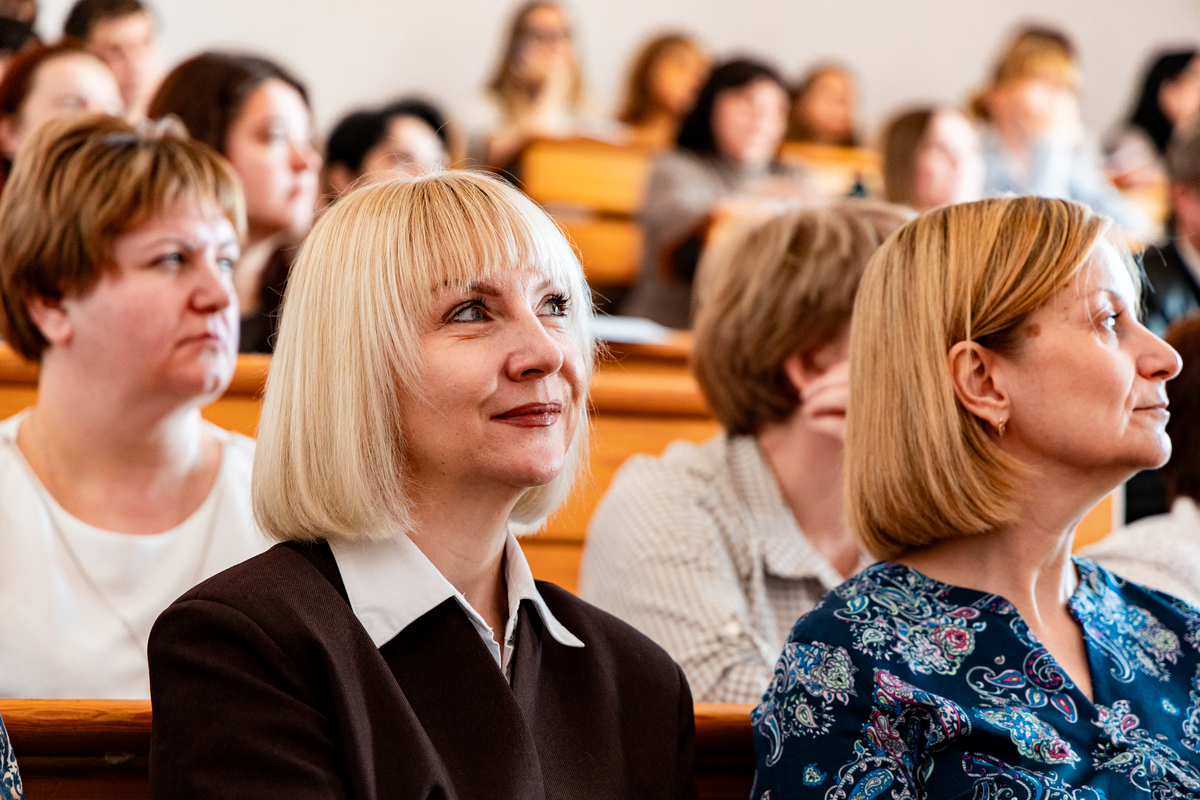 В аудитории собрались многие наши выпускники. Эти обстоятельства накладывают на нас очень большую ответственность. Мне очень приятно видеть здесь и наших магистрантов, которые сегодня учатся и одновременно преподают в школе. И особенно я горжусь тем, что среди вас присутствует моя однокурсница Нина Васильевна Зубкова, которая больше 50 лет работает учителем русского языка и литературы в Гимназии №5
