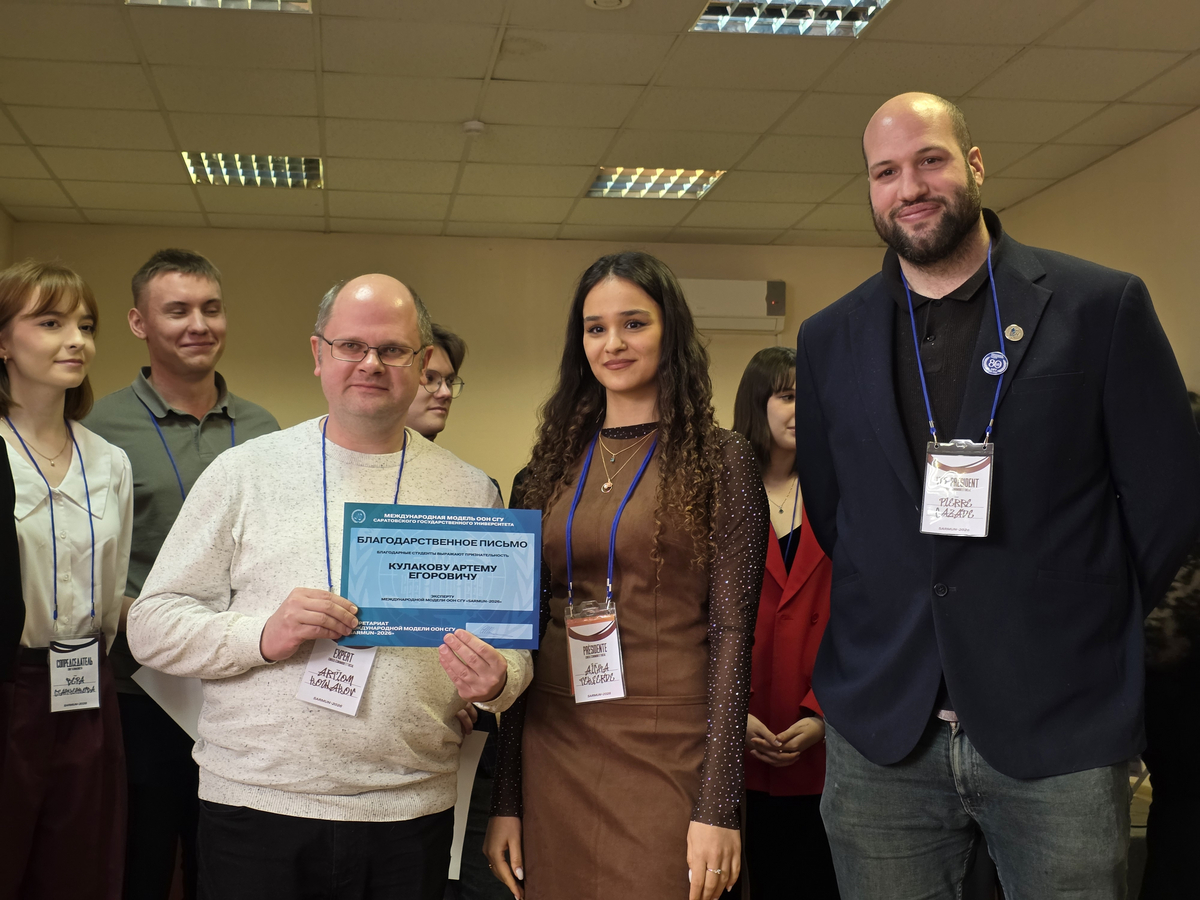 Перед награждением участников Совета Безопасности эксперт комитета Д.С. Алексеев, доцент кафедры международных отношений и внешней политики России ИИиМО СГУ, отметил готовность участников комитета к профессиональному диалогу, их плодотворную работу, итогом которой стала качественная и конструктивная резолюция.