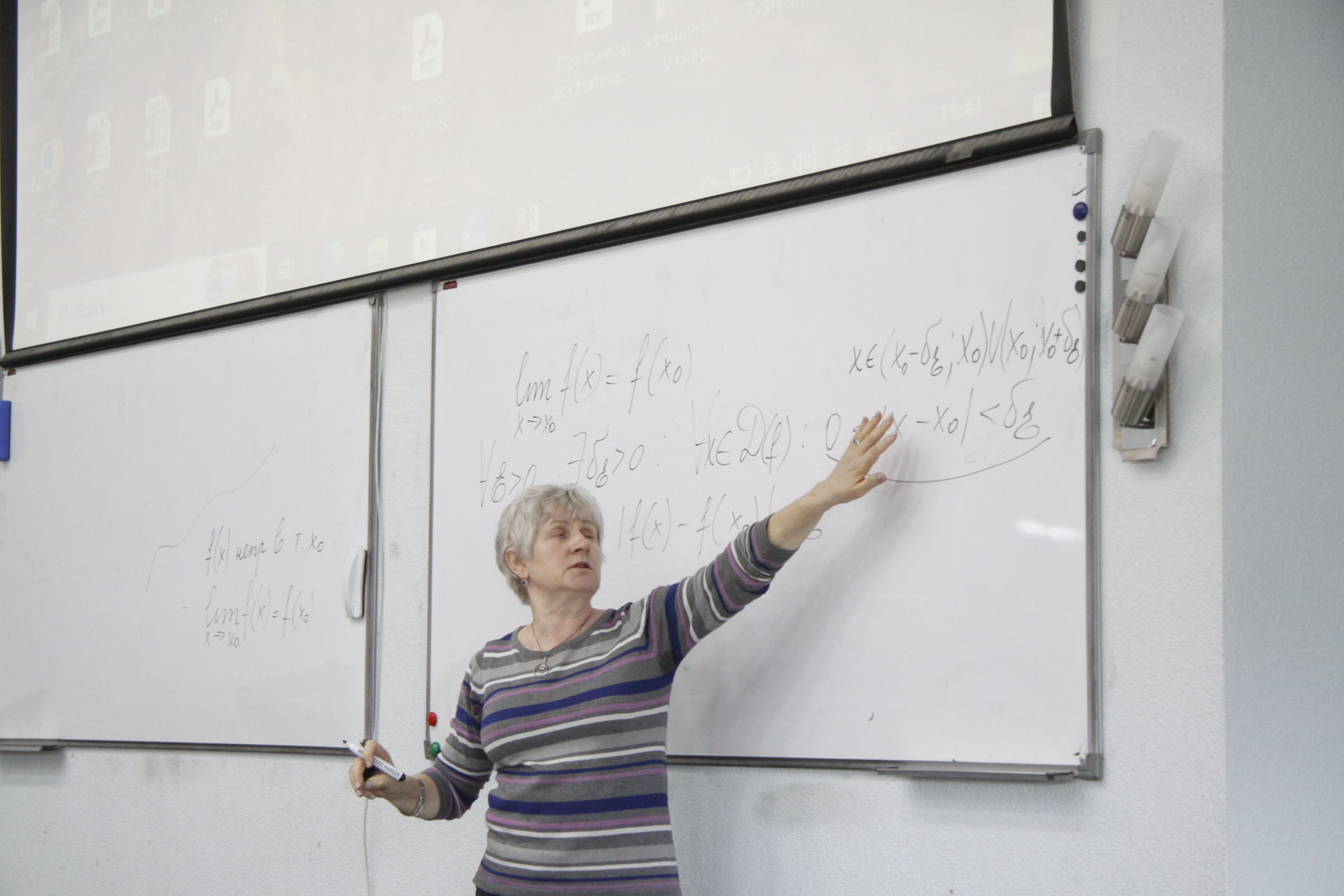 На доске разбирались ключевые теоремы, включая знаменитый постулат Больцано – Коши о промежуточном значении. С помощью графиков и вложенных отрезков лектор наглядно показала: если непрерывная функция на концах отрезка принимает значения разных знаков, внутри обязательно найдется точка, где она равна нулю.