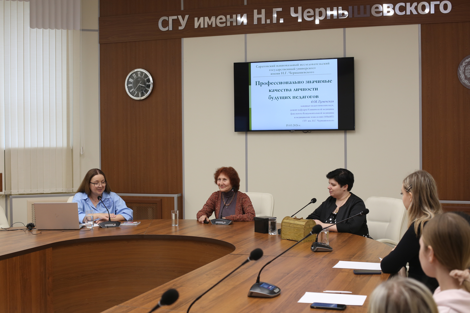 Первая часть встречи прошла под руководством доцента кафедры клинической медицины О.М. Гуменской. Лекция началась с оживлённой экспресс-дискуссии. Школьники читали стихи о труде педагога и делились своими представлениями о том, каким должен быть «Учитель с большой буквы». В ходе обсуждения участники выделили целый спектр профессионально значимых качеств личности педагога: эмпатию, справедливость и отзывчивость; глубокое знание предмета и креативность; выдержку, терпение и доброту; коммуникабельность и критическое мышление.