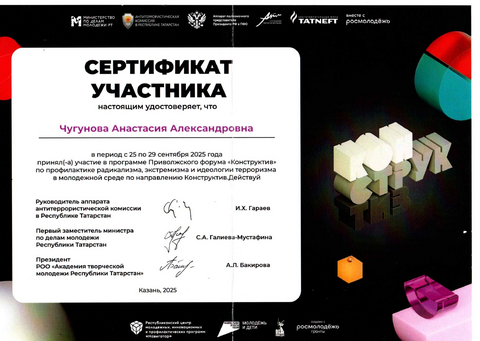 Магистрантка факультет психологии первого года обучения профиля «Юридическая психологии» Чугунова Анастасия Александрова приняла участие в программе приволжского форума «Конструктив» по профилактике радикализма, экстремизма и идеологии терроризма, который прошел 25-29 сентября 2025 года в г. Казань на базе Молодежного центра «Волга».