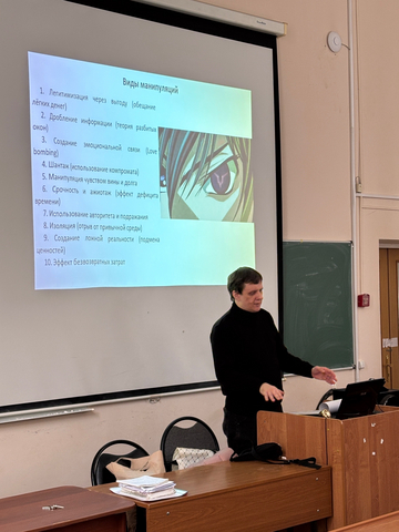 Для студентов 1 и 4 курсов факультета психологии были проведены интерактивные лекции, посвященные актуальной проблеме психопрофилактики вовлечения молодежи в деструктивные организации. Основной акцент мероприятия был сделан на психологических механизмах вербовки и методах скрытого управления сознанием.