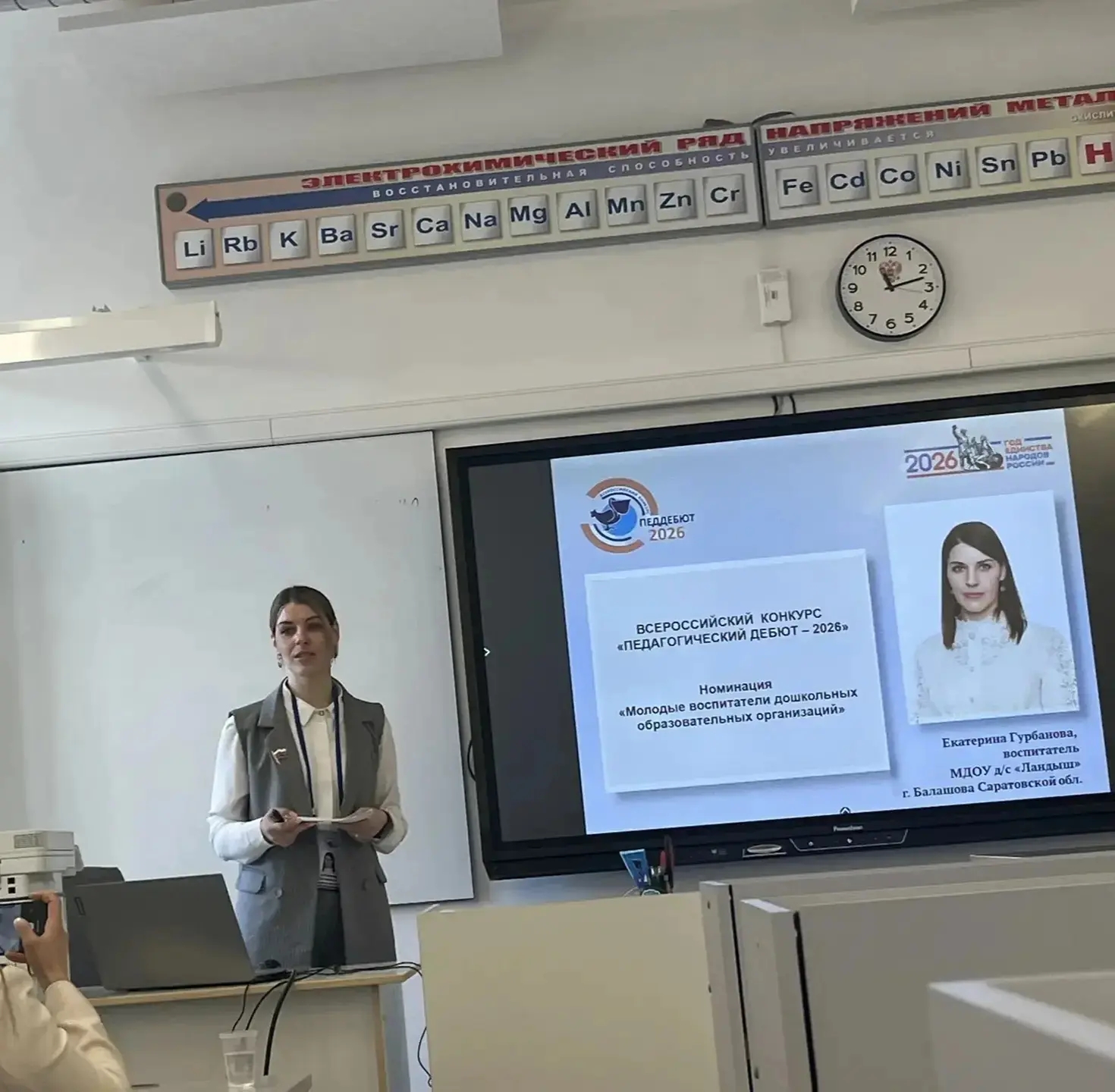 В номинации «Молодые воспитатели дошкольных образовательных организаций» Саратовскую область представила Екатерина Владимировна Гурбанова — воспитатель муниципального дошкольного образовательного учреждения «Детский сад комбинированного вида «Ландыш» города Балашова. За несколько конкурсных дней она продемонстрировала высокий уровень профессионализма: успешно презентовала свой педагогический опыт, представила публичное выступление, провела учебное занятие и справилась с профессиональными кейсами.