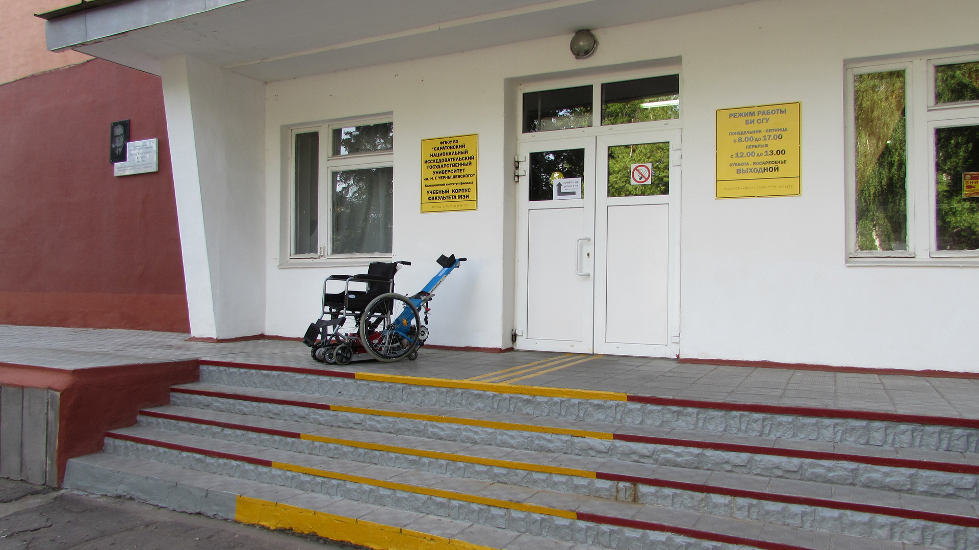 В зданиях, предназначенных для реализации программ подготовки студентов с инвалидностью, имеется вход, доступный для лиц с нарушением опорно-двигательного аппарата. Помещения, где могут находиться люди на креслах-колясках, размещены на уровне доступного входа.
