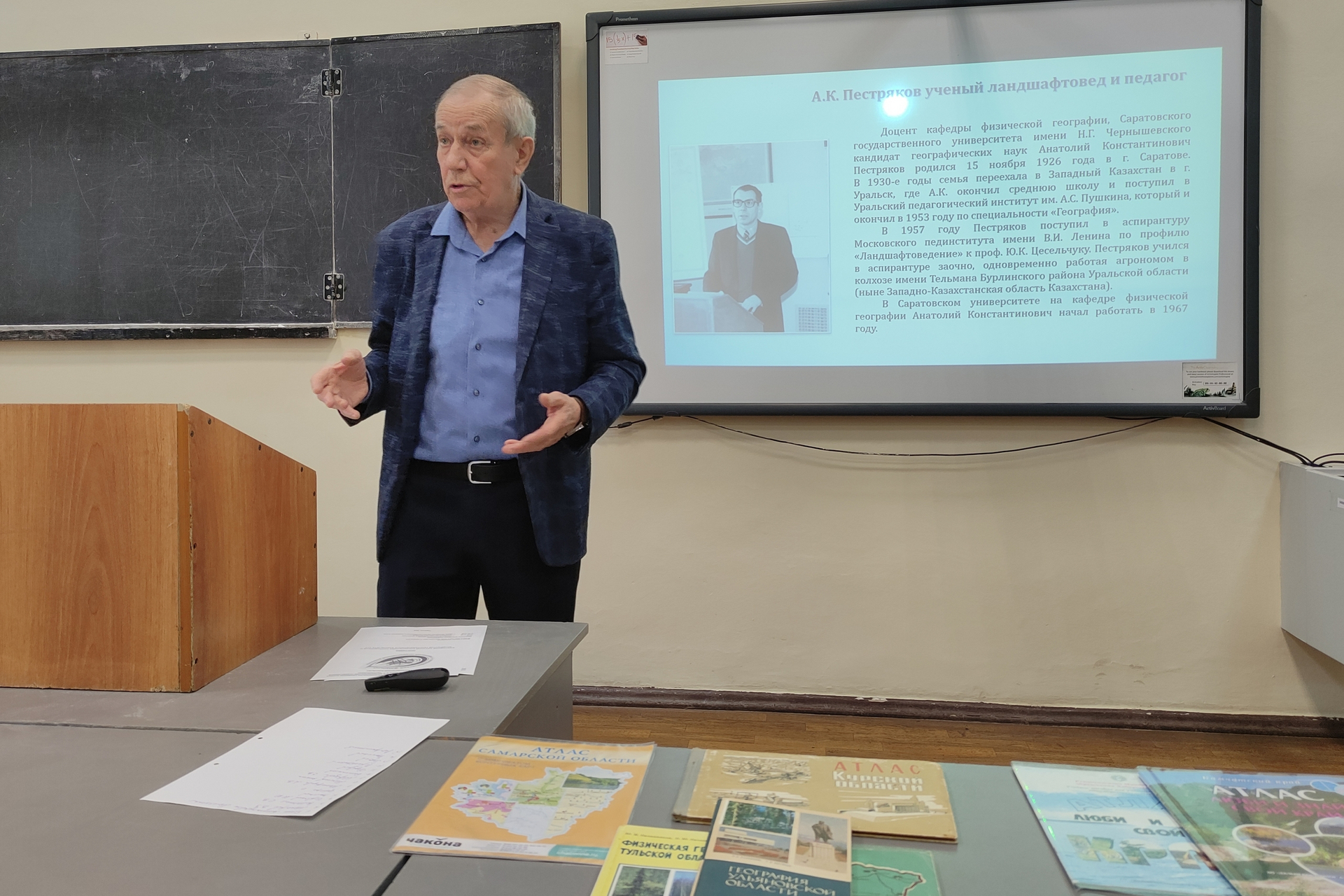 Завершил пленарную сессию доцент кафедры физической географии и ландшафтной экологии Александр Николаевич Башкатов с докладом «Образная география Саратовской области». В своем выступлении Александр Николаевич представил результаты междисциплинарного исследования, в котором географическое пространство региона рассматривается сквозь призму ландшафта, литературы, живописи, топонимики и историко-культурного наследия. Он продемонстрировал, как формируются устойчивые образы территории: от купеческого Саратова до Бурацкого леса на севере области, и как эти образы влияют на восприятие нашего региона ее жителями и гостями. Доклад вызвал живой интерес аудитории, объединив строгий географический анализ с элементами культурологии и краеведения.