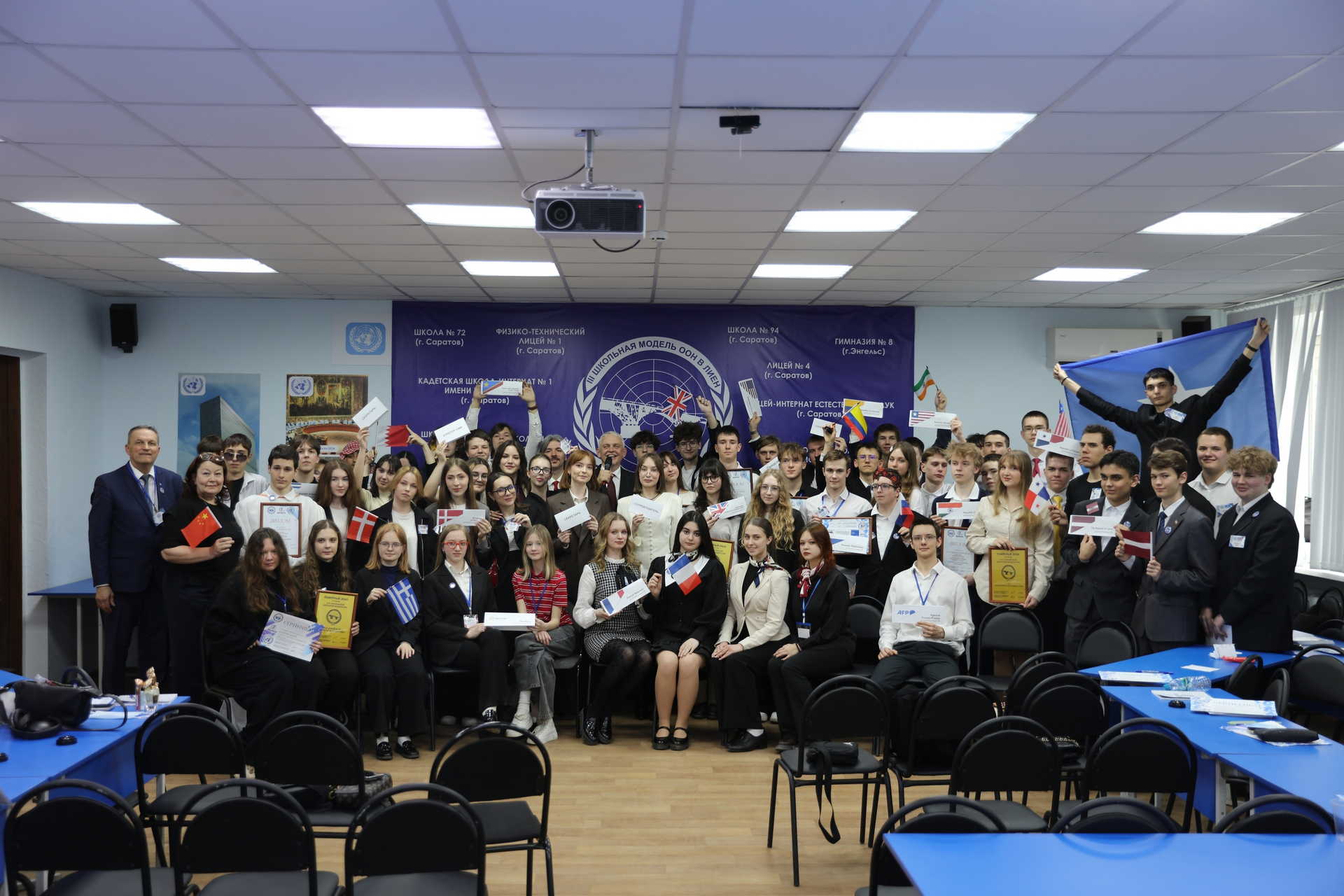 В число почетных гостей модели ООН вошли представители общественности, бизнеса и научно-образовательного сообщества Саратовской области. От лица СГУ им. Н. Г. Чернышевского с приветственным словом к участникам мероприятия обратились проректор по международной деятельности С. А. Шилова, директор Института дополнительного профессионального образования, заведующий кафедрой международных отношений и внешней политики России, профессор Ю. Г. Голуб, декан юридического факультета, профессор Г. Н. Комкова и профессор кафедры международных отношений и внешней политики России В. Г. Цыплин. Они выразили уверенность в том, что все школьники благодаря данному образовательному проекту получат бесценный опыт ведения переговоров и поиска компромиссов в сложных ситуациях, который будет им полезен в жизни даже в том случае, если они не станут в будущем дипломатами. Помимо приветственных слов, в своем выступлении профессор Ю. Г. Голуб обозначил основные достижения ООН, а также трудности, с которыми сталкивается Организация Объединенных Наций в настоящий момент.