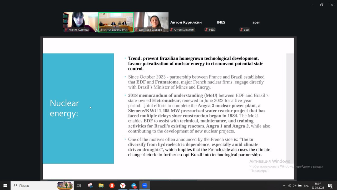 В прозвучавших докладах участников конференции была затронута проблематика геополитических реалий взаимодействия Бразилии и стран Европы. Поняты проблемы: понимания суверенитета в Бразилии в контексте отношений со странами ЕС и с Россией; сложностей процесса суверенизации Бразилии в технологической и цифровой сферах; взаимодействия Бразилии и Евросоюза в политических и правовых плоскостях.