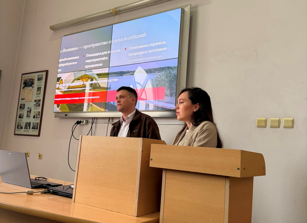 Встреча прошла в формате открытого диалога. Представители базы «Волжино» — менеджер по персоналу Юлия Нурмамятова и старший администратор Артем Бушманов рассказали студентам о структуре и особенностях работы базы отдыха, о специфике работы со своей целевой аудиторией. В видеопрезентации студентам показали гостиничные номера и коттеджи, ресторан, зону отдыха у бассейна и пляж, инфраструктуру для проведения мероприятий.