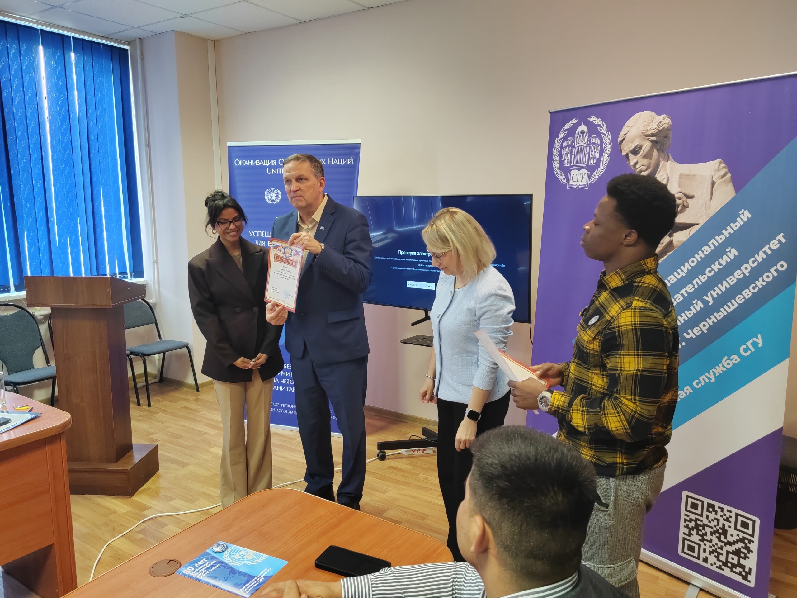 После лекции иностранные студенты СГУ выступили с ответным словом. Харкуше Шаймаа, студентка четвертного курса Института истории и международных отношений, представила доклад о роли Марокко в регионе и мире. Студент 1 курса магистратуры факультета гуманитарных дисциплин, русского и иностранных языков Кедессина Гнояроу рассказал о насущных проблемах в своей родной стране – Того – и роли ООН в решении этих проблем. Присутствующие студенты получили памятные подарки с символикой ООН.