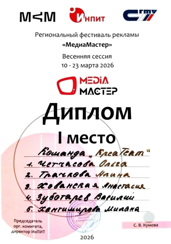 Студенты направления «Реклама и связи с общественностью» приняли участие в весенней сессии регионального фестиваля рекламы «МедиаМастер-2026», прошедшего 13-20 марта на базе Института прикладных информационных технологий СГТУ имени Гагарина Ю.А.