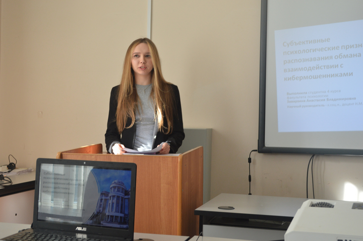 3 место – Заварзина Анастасия Владимировна, студентка 4 курса факультета психологии. Тема доклада: «Субъективные психологические признаки распознавания обмана при взаимодействии с кибермошенниками». Научный руководитель: к.соц.н., доцент Н.М. Романова.