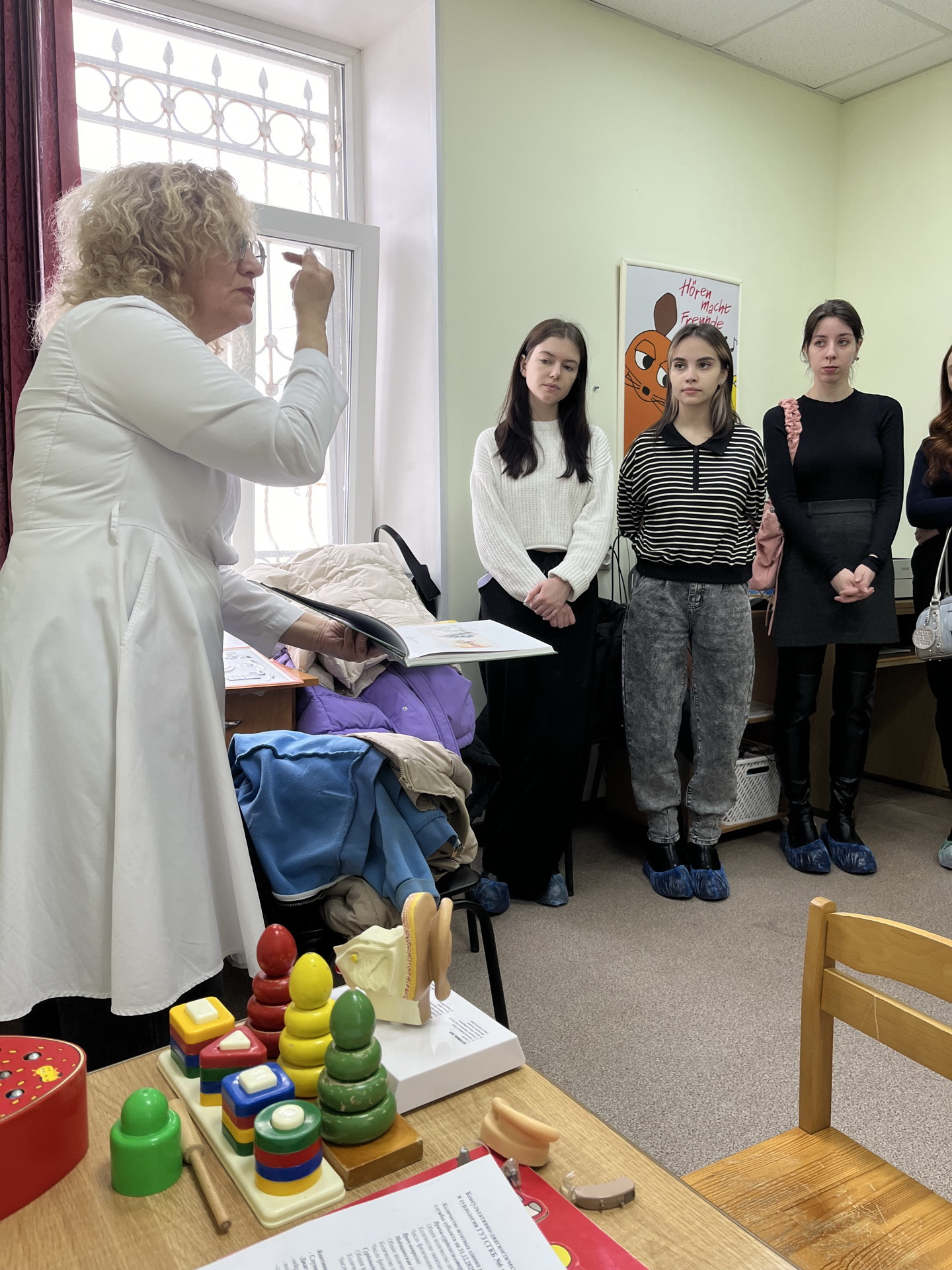 Студенты-бакалавры 4 курса, в рамках дисциплины «Логопедия» посетили Консультативно-диагностическое отделение Центра оториноларингологии и сурдологии ГУЗ «СГКБ № 6 им. ак. В.Н. Кошелева». Интересную лекцию провела главный внештатный логопед министерства Здравоохранения, сурдопедагог, логопед центра – Ирина Альфредовна Верещагина.Ирина Альфредовна провела познавательную экскурсию для студентов, они увидели современные врачебные и диагностические кабинеты, в которых осуществляется прием пациентов с нарушениями слуха. Студенты-логопеды смогли увидеть процесс диагностики слуховой функции у ребенка и узнать, с помощью каких приборов проводится изучение слуха.