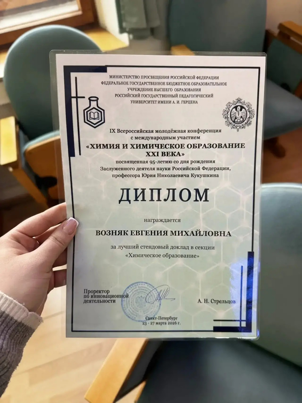 С 23 по 27 марта на базе факультета химии РГПУ им. А. И. Герцена проходила IX Всероссийская молодёжная конференция с международным участием «Химия и химическое образование XXI века», посвященная 95-летию со дня рождения Заслуженного деятеля науки Российской Федерации, профессора Юрия Николаевича Кукушкина.