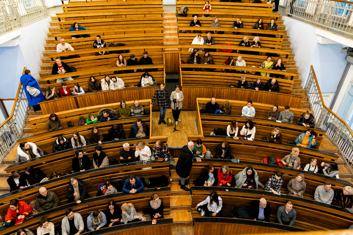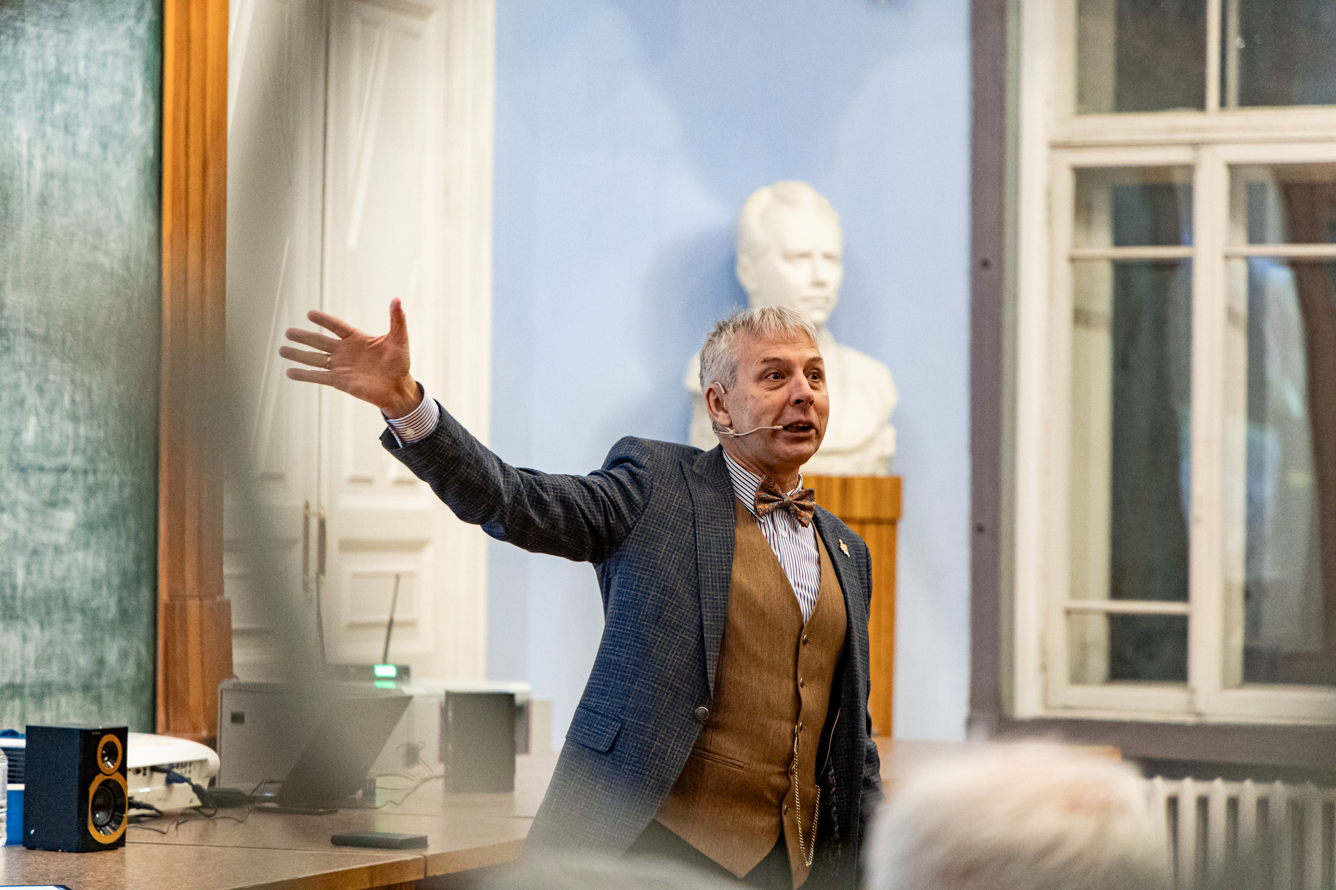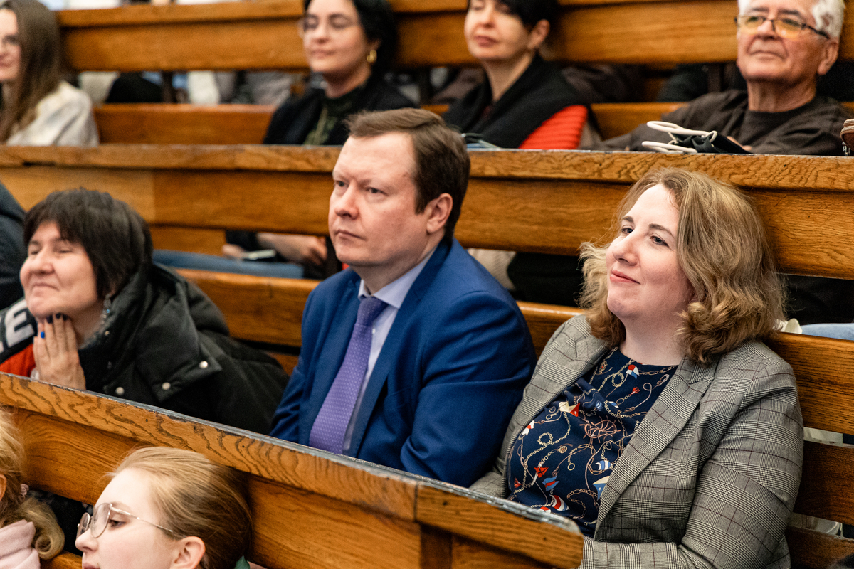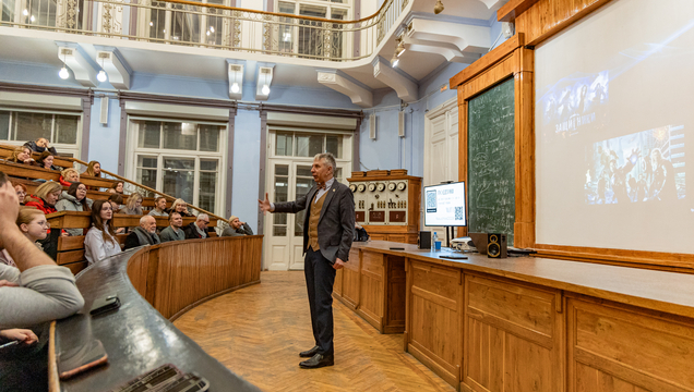 В знаменитой Большой физической аудитории СГУ рассуждали, чем мифы отличаются от сказок и почему на самом деле мы не знаем ни того, ни другого. Лекцию сопровождала игра на фортепиано в исполнении студента 4 курса Института химии Андрея Тараненко. Впервые за 115 лет в Большой физической аудитории играло пианино.