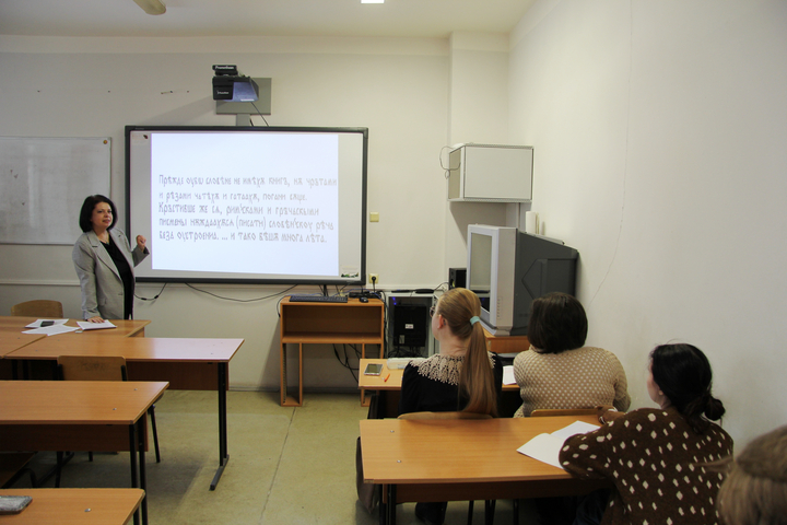 В среду, 25 февраля, в Клубе абитуриентов Института филологии и журналистики прошло занятие, посвящённое истории славянской письменности. Его провела кандидат филологических наук, доцент кафедры теории, истории языка и прикладной лингвистики Юлия Валерьевна Каменская.