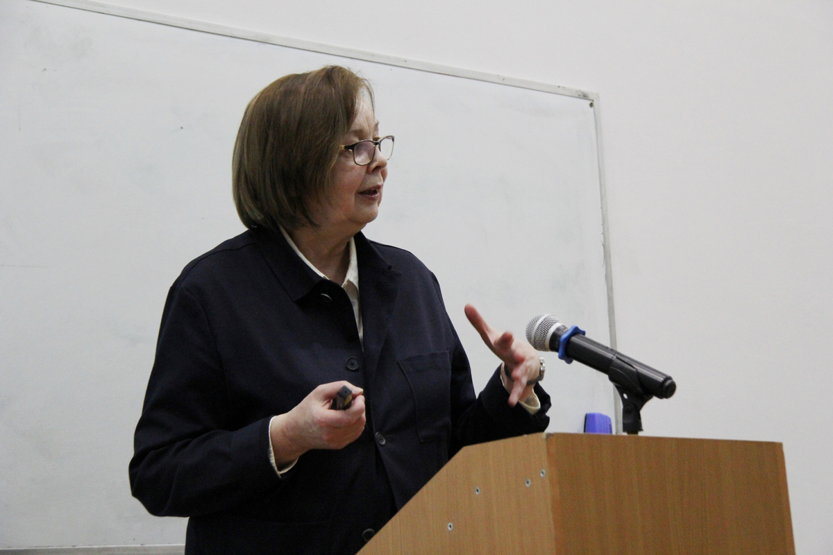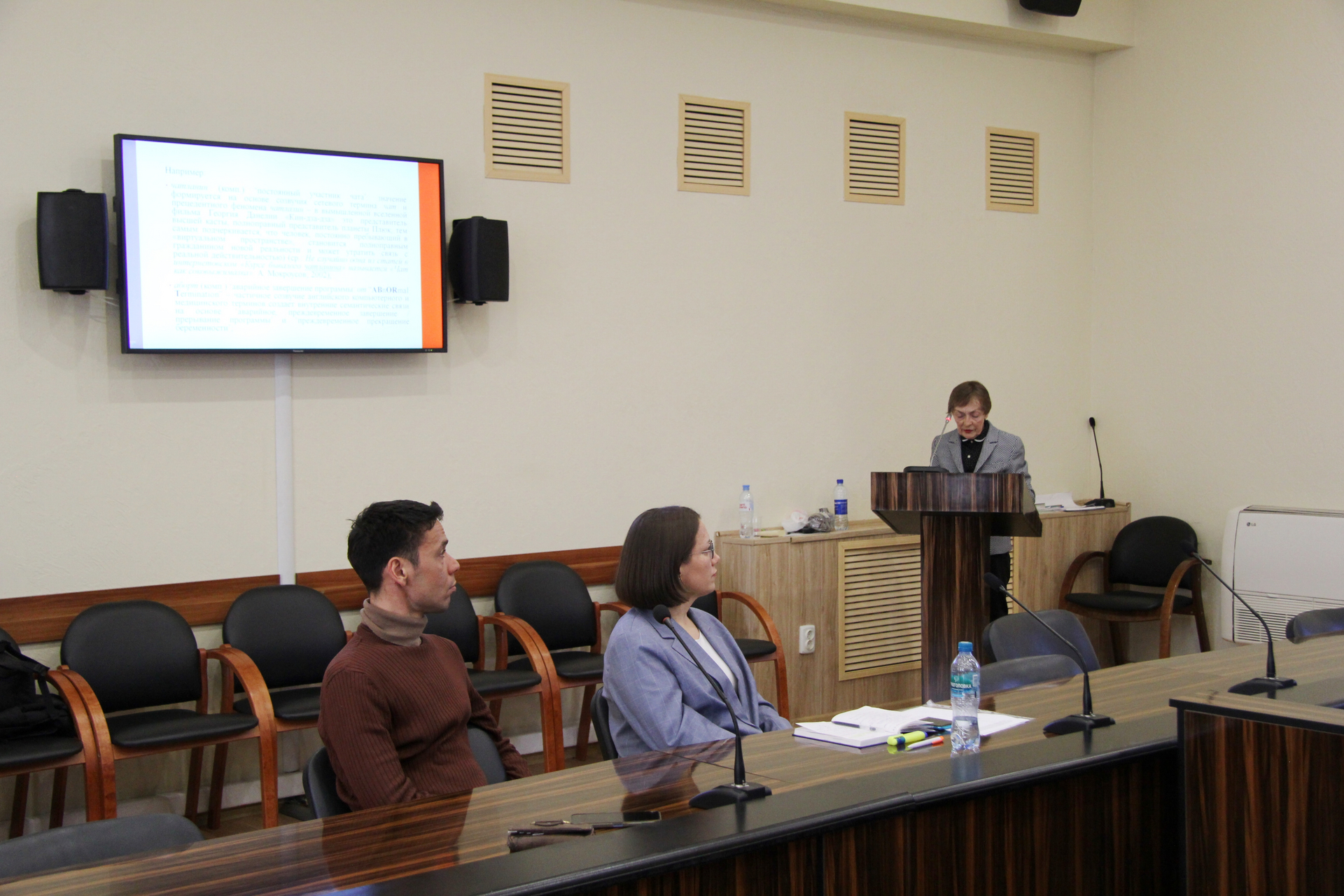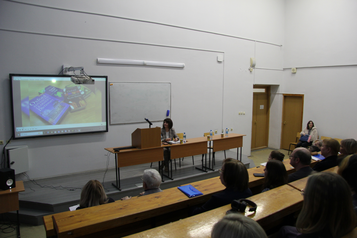 Программа пленарного заседания также включала выступление профессора кафедры русского языка, речевой коммуникации и русского как иностранного Ольги Викторовны Мякшевой на тему «Дискуссия о государственном языке РФ и проблема “размывания традиционных российских духовно-нравственных и культурно-исторических ценностей”». Ольга Викторовна познакомила присутствующих с ведущимися в научной среде дискуссиями о кодифицировании русского языка в его статусе государственного.