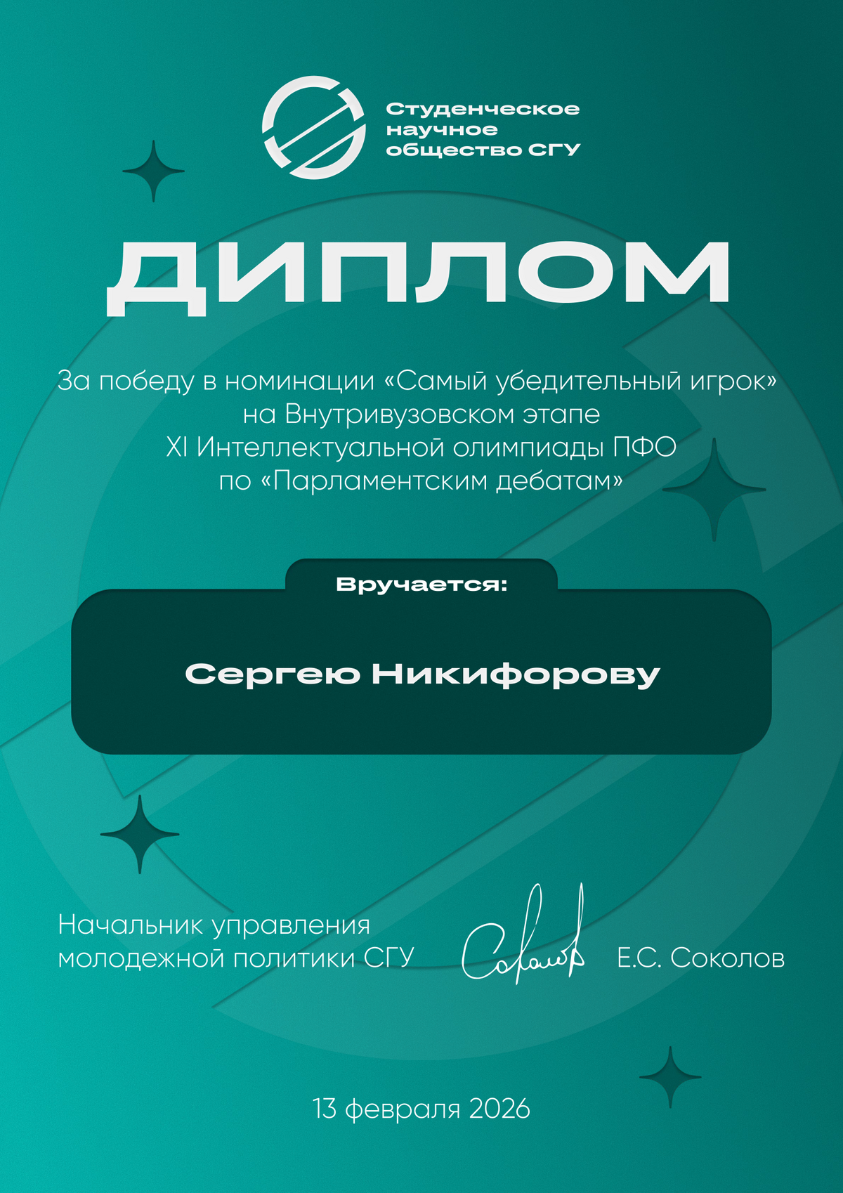 13 февраля 2026 года в СГУ завершился внутривузовский отборочный этап XI Интеллектуальной олимпиады Приволжского федерального округа среди студентов. Одним из заключительных состязаний стали Парламентские дебаты. Это динамичное и захватывающее соревнование потребовало от участников блестящего владения ораторским искусством, безупречной логики и умения работать в команде.