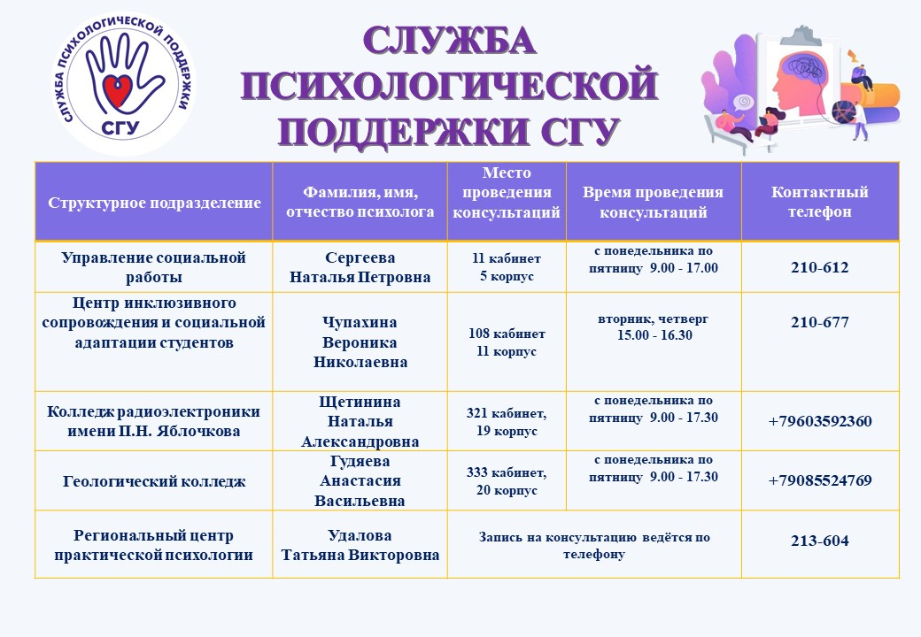 Для получения индивидуальной психологической и/или кризисной помощи нужно записаться на прием к специалисту Службы психологической поддержки по телефону (см. таблицу ниже), а также можно обратиться к руководителю Службы психологической поддержки - Сергеевой Наталье Петровне в V корпус СГУ, каб. 11, или по телефону 210-612, или по электронной почте sergeevanp@info.sgu.ru.