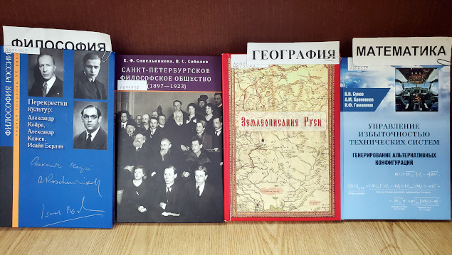 На выставке представлены монографии, сборники статей, учебные пособия, изданные в 2020-2024 годах в разделах: история (11), философия (2), религиоведение (1), искусство (3), психология (5), социология (2), право (4), образование (2), политика (4), языкознание (1), литературоведение (8), медицина (2), биология (1), география (1), математика (3), физика (3), экономика (1), военные науки (3) и Personalia (2).