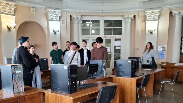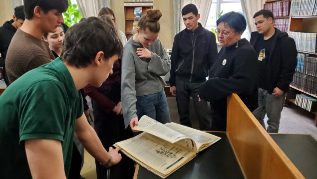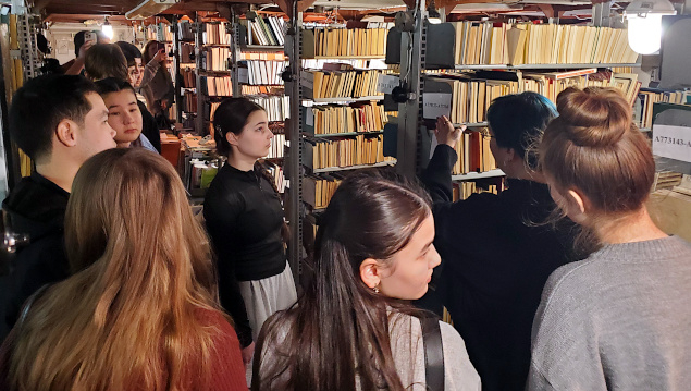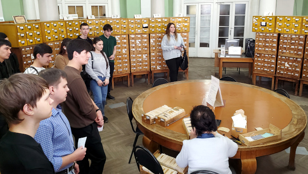 Далее студенты посетили зал каталогов, где познакомились с организацией карточных каталогов (алфавитных, систематического), системой поиска и заказа книги через читальный зал научных работников и абонемент. В книгохранилище экскурсанты увидели, как хранятся книги.