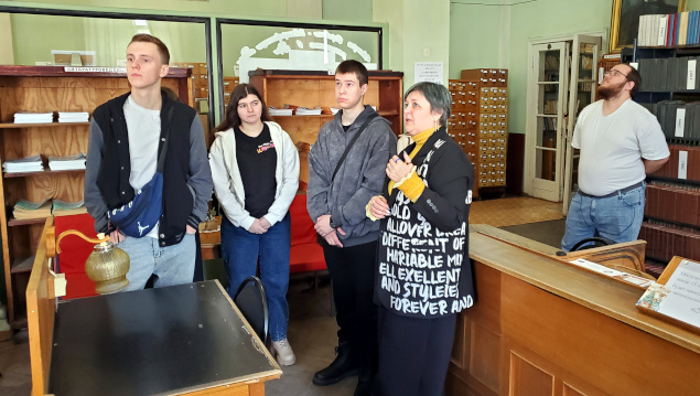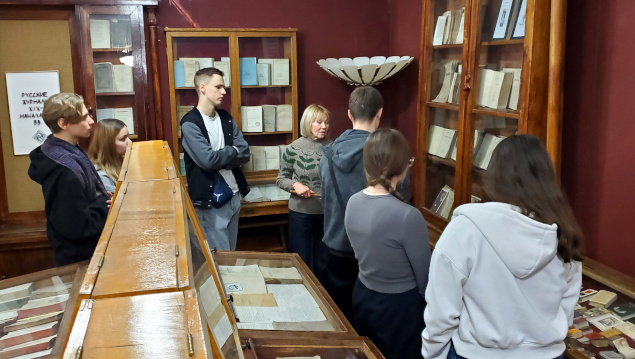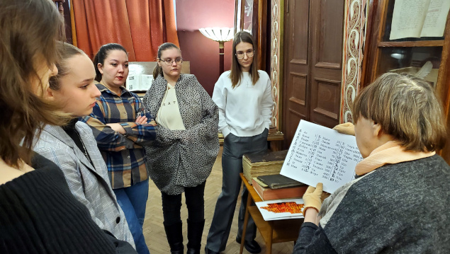 Во второй части экскурсии на выставке по истории русской книги студенты узнали об особенностях рукописных и старопечатных изданий, о журналах екатерининского, петровского времени и Серебряного века, увидели издания с автографами, познакомились с особенностями формирования фонда отдела редких книг и рукописей, услышали о коллекционерах-дарителях.